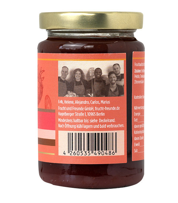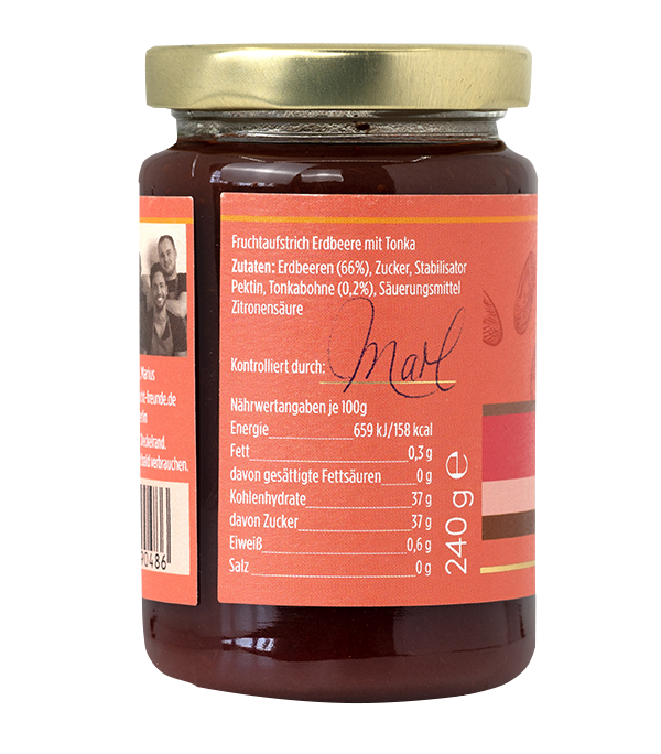 Zutaten: Erdbeeren (66%), Zucker, Stabilisator Pektin, Tonkabohne (0,2%), Säuerungsmittel Zitronensäure Ohne Konservierungsstoffe